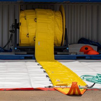 Ideal para operaciones en zonas portuarias, cuerpos de agua o industrias que requieren una solución rápida para el manejo y traslado de barreras de contención.